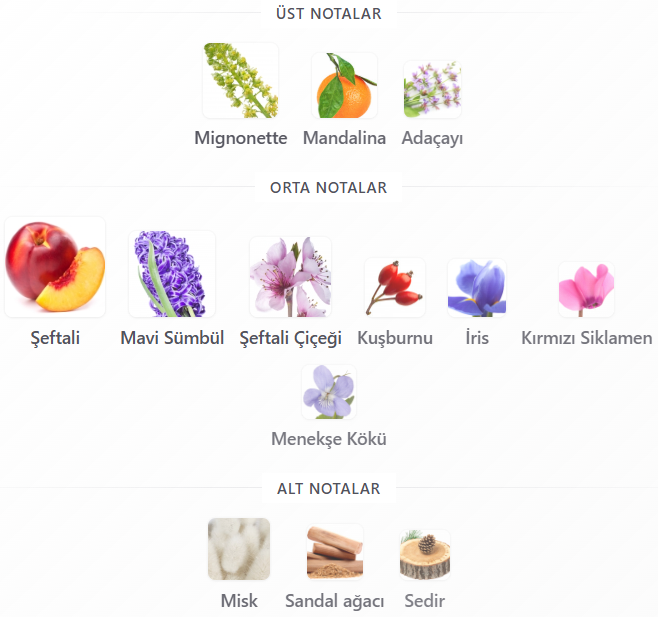 Mandalinanın parlak narenciye ferahlığı havada ince bir ışıltıyla açılırken, şeftalinin ipeksi tatlılığı kokuyu sıcak ve yumuşak bir tona taşıyor. Çiçeksi akorlar bu tazeliğin etrafında zarif bir hafiflik yaratıyor. Sanki pamuk bulutların arasında yürür gibi bir his. Dipte sandal ağacının sakin odunsuluğu ve miskin temiz dokusu birleşerek huzurlu, rahat ve doğal bir siluet bırakıyor.