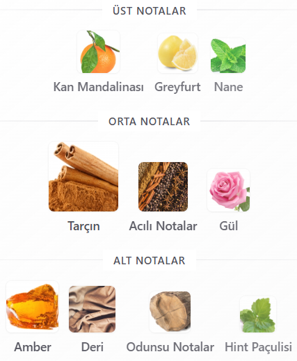 Tarçının sıcak ve tatlı baharatı havaya yayılır yayılmaz, altın bir yüzeye düşen ışık gibi parlayan bir enerji ortaya çıkıyor. Kan portakalının şekerli ferahlığı bu sıcaklığı içerden aydınlatıyor, yoğun ama parlak bir kontrast yaratıyor. Dipten yükselen deri ve kehribar dokusu kokuyu karanlık, dumanlı ve baştan çıkarıcı bir sıcaklığa çeviriyor. Zenginlik hissi veren, ağırbaşlı ama kışkırtıcı bir siluet gibi.