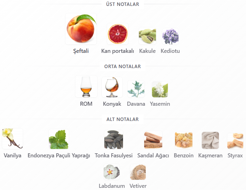 İlk nefeste şeftalinin meyvemsi tatlılığı yoğun bir şekilde yükselirken, arkadan gelen baharatlı ve odunsu dokunuşlar kokuyu kararlı ve derin bir çizgiye taşıyor. Reçineli sıcaklık ve hafif kremamsı vanilya, tatlılığı sarıp sarmalayarak cezbedici bir tensellik bırakıyor. Sonunda tende kalan iz, dolgun, şehvetli ve geceye çok yakışan koyu bir meyve kokusu.