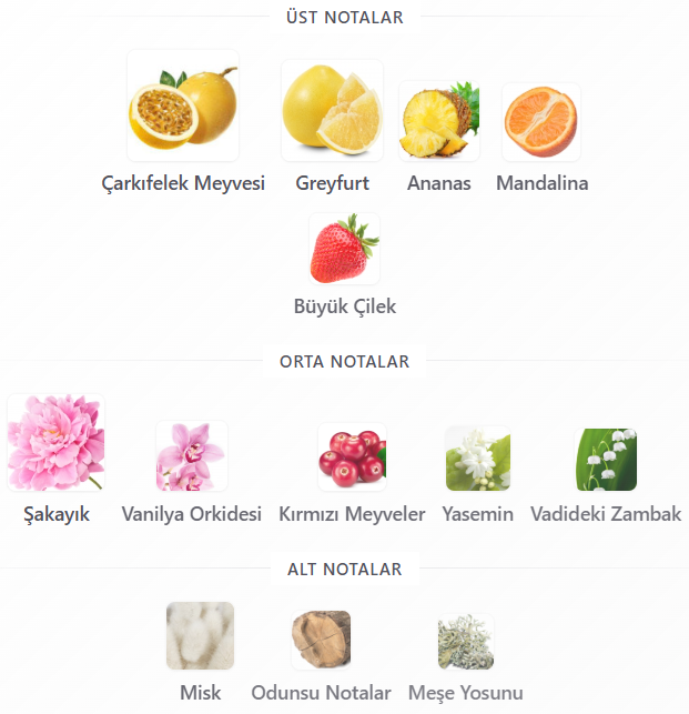 Açılışta sulu bergamot, çarkıfelek meyvesi ve kırmızı meyvelerin parlak tatlılığı bir anda ferah bir enerji patlaması gibi yükseliyor. Kalpte şakayık ve orkidenin pembe çiçeksi dokusu beliriyor. Hem feminen hem de capcanlı bir hava oluşturuyor. Dipte misk ve hafif odunsu notalar kokuyu temiz, genç ve taze bir ten kokusu gibi sabitliyor. Günlük kullanıma tam bir “kendiliğinden çekicilik”.